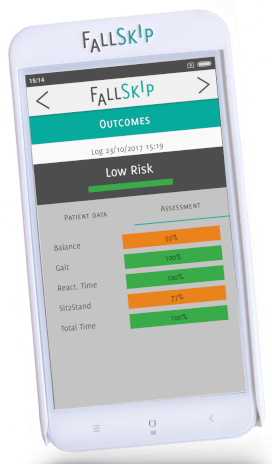 El dispositivo Fallskip es un sistema portátil que se fija a un cinturón y mide mediante dispositivos inerciales una serie de parámetros cuantitativos (equilibrio postural, biomecánica de la marcha, tiempo de reacción fuerza de los miembros inferiores) que se combinan con variables clínicas e informan del riesgo que tiene una persona de edad de caer.